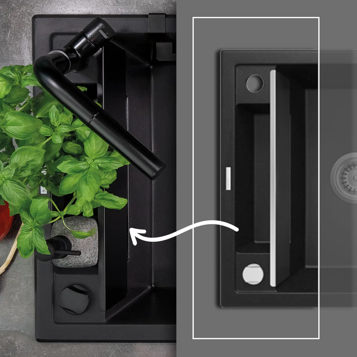 Do każdego zlewozmywaka Magnetic dołączona jest stalowa maskownica, która pełni funkcję praktycznej półki. Jej zadaniem jest wydzielenie dodatkowej przestrzeni, po której woda swobodnie spływa do komory. To niewielki element, a potrafi znacząco ułatwić codzienne korzystanie ze zlewu. Na półce można odłożyć mokrą gąbkę czy szczotkę do naczyń, co pozwala zachować porządek i higienę w kuchni. Równie dobrze sprawdzi się jako miejsce na buteleczkę z płynem do mycia naczyń albo drobne doniczki z ulubionymi ziołami, które zawsze będą pod ręką.
