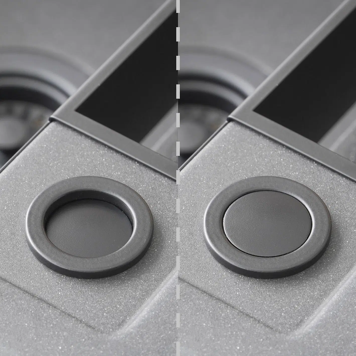 W zlewozmywakach Magnetic zastosowano sprytne rozwiązanie – magnesy ukryte wewnątrz masy granitowej, całkowicie niewidoczne od strony użytkownika. To dzięki nim możliwe jest stabilne mocowanie stalowych maskownic oraz specjalnie zaprojektowanych akcesoriów, takich jak relingi, uchwyty czy koszyki. System działa bez ingerencji w blat czy wiercenia dodatkowych otworów, a jednocześnie zachowuje pełną estetykę całej kuchni.