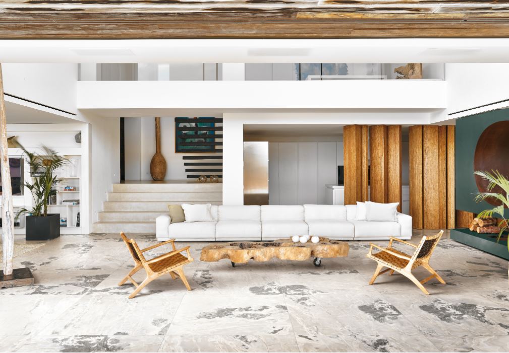 Połączenie płytki o głębokiej strukturze (np. Silver Porphyry Strutturato) z transparentnym szkłem lub surowym kamieniem (np. łupek, bazalt) pozwala uzyskać przestrzeń nowoczesną, minimalistyczną i pełną kontrastów. To świetne rozwiązanie dla projektów o charakterze industrialnym lub zen – tam, gdzie światło, faktura i proporcje tworzą atmosferę. Efekt potęguje użycie dużych formatów, które zlewają się optycznie z taflami szkła i tworzą wizualną ciągłość.