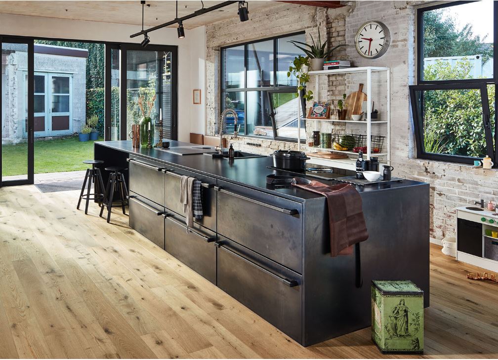 W tej aranżacji industrialny klimat budują kontrasty – ciemna, metaliczna podłoga zestawiona została z prostym, białym blatem i frontami z surowego drewna. Otwarta konstrukcja, widoczne skrzynki i metalowy regał na kółkach przywodzą na myśl wnętrza dawnych warsztatów czy fabryk, a całość ocieplają detale – naturalne światło wpadające przez duże okna i akcenty w postaci zieleni. To kuchnia w duchu loftu, która równocześnie zachowuje przytulny, domowy charakter.