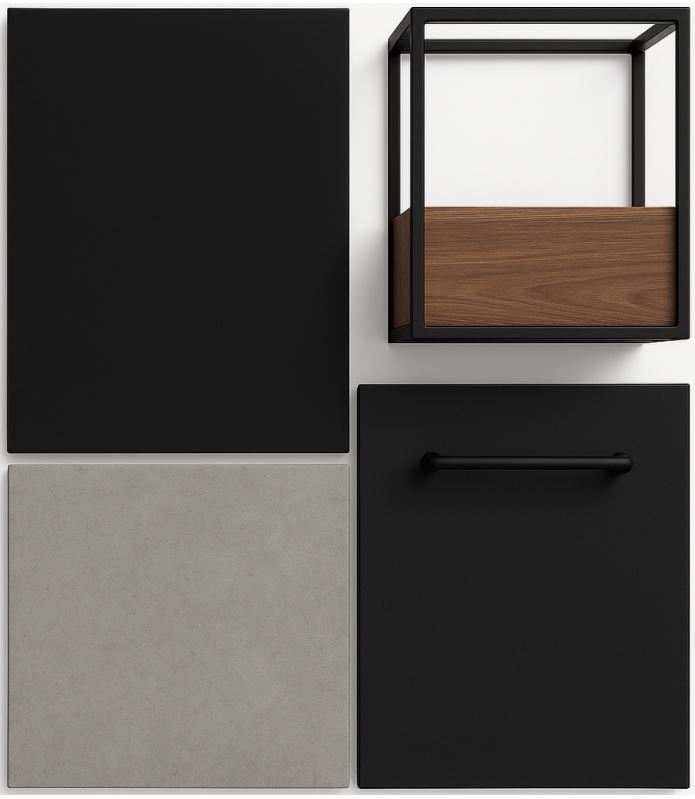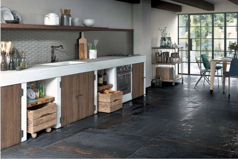 Płytka Serenissima Costruire Metallo Nero 100 × 100 cm odgrywa w tym wnętrzu kluczową rolę – jej powierzchnia imituje postarzały metal, pełen niuansów i przetarć w odcieniach rdzawego brązu i antracytu. Dzięki temu podłoga staje się mocnym, niemal scenograficznym tłem, które nadaje kuchni głębi i autentyczności. To wybór idealny dla przestrzeni industrialnych, gdzie podłoga nie tylko dopełnia aranżację, ale wręcz definiuje jej charakter.