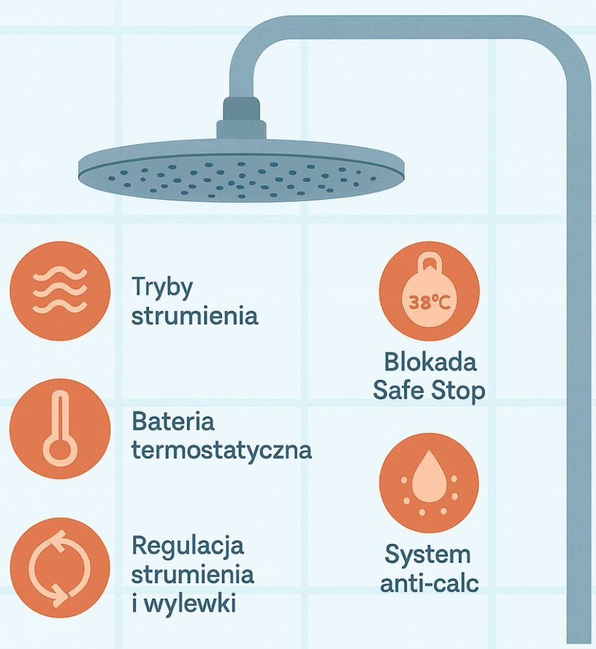 - blokada Safe Stop (np. 38 °C) – dodatkowy element bezpieczeństwa, szczególnie ważny w łazienkach z dziećmi i osobami starszymi;