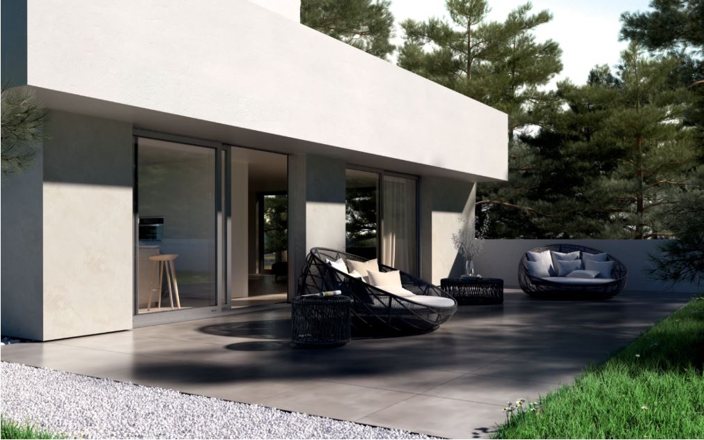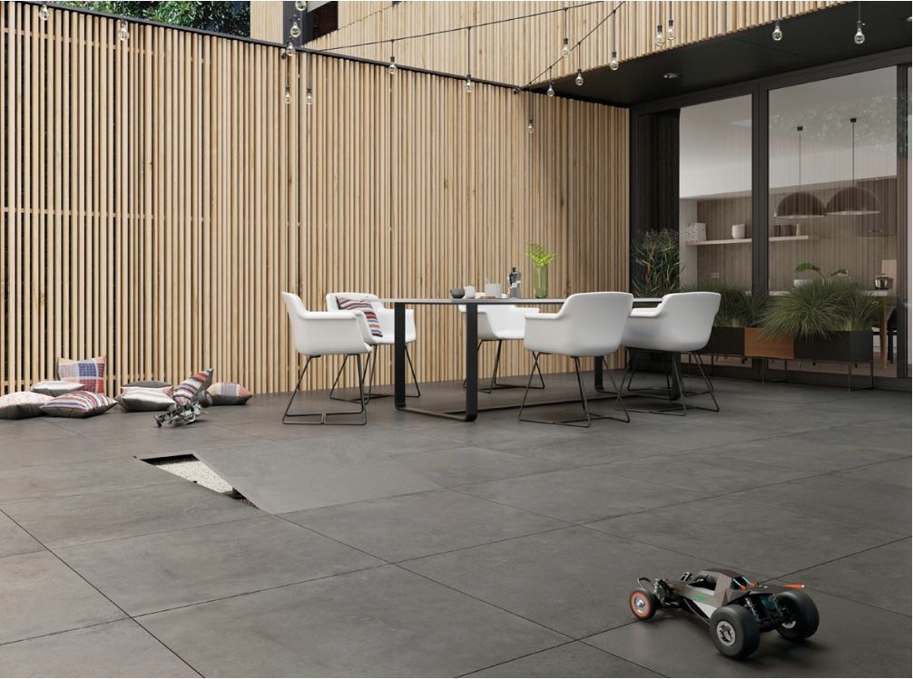 - Duże formaty dla przestronnych tarasów. Dla rozłożystych tarasów, które okalają dom z dwóch lub trzech stron, warto wybrać płytki o dużym formacie. Wielkoformatowe płytki, takie jak 120x120 cm, wpływają na estetykę i minimalizują ilość fug. Dla nowoczesnych domów z białą elewacją i dużymi przeszkleniami zalecamy szczególnie ciemne płytki.