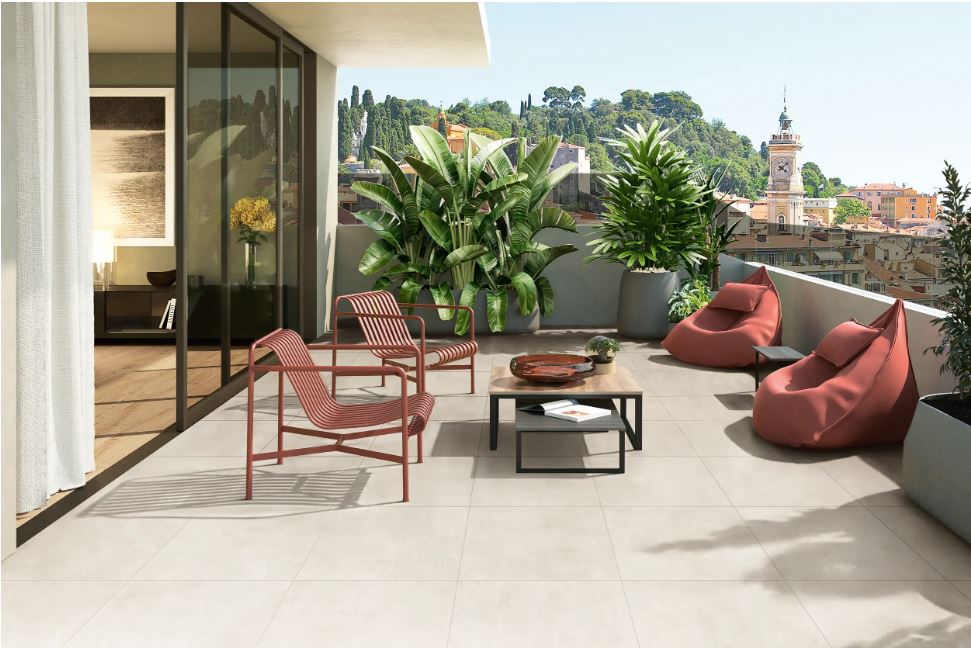 - Płytki o wyglądzie betonu. Płytki imitujące beton, takie jak modele z kolekcji Novabell Open, doskonale uzupełniają nowoczesne ogrody z wyeksponowanymi elementami żelbetowymi, nadając całości industrialnego charakteru. Jaśniejsze warianty kolorystyczne betonu można zastosować także na balkonie.