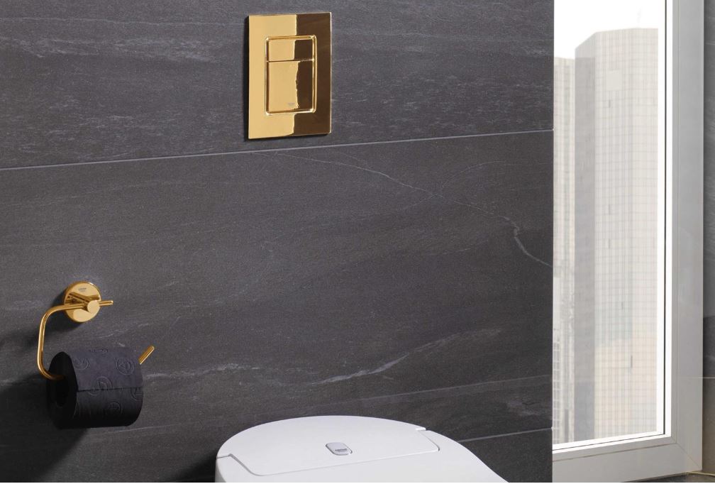 - spójność strefy WC i bidetu można podkreślić designerskim przyciskiem spłukującym, takim jak Grohe Skate Cosmopolitan w odcieniu Cool Sunrise,