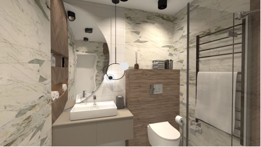 - odpowiednie oświetlenie, lustra i ukryte przechowywanie pomagają osiągnąć efekt większej łazienki,