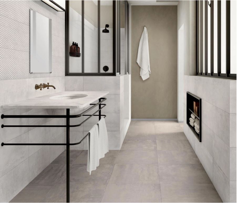 Na powyższej aranżacji dobrze widać, jak jasne płytki z kolekcji Piemme Materia – zarówno na ścianach, jak i podłodze – nadają łazience lekkości i optycznie ją powiększają. Rozbielone szarości i ciepłe beże odbijają naturalne światło, które dodatkowo wzmacnia duże okno, a harmonijna tonacja materiałów sprawia, że przestrzeń wydaje się bardziej spójna i otwarta. Subtelne zróżnicowanie faktur między strefą umywalki a resztą wnętrza dodaje głębi, nie wprowadzając przy tym chaosu.