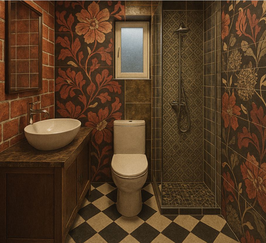 Powyższa wizualizacja została stworzona ku przestrodze — pokazuje, jak ciemne kolory, mocne wzory, zróżnicowane faktury i kontrastowe fugi mogą przytłoczyć małą łazienkę, zaburzając jej proporcje i optycznie zmniejszając przestrzeń. To przykład aranżacji, w której zabrakło spójności i umiaru, a każdy detal, zamiast rozjaśniać wnętrze, działa na jego niekorzyść.