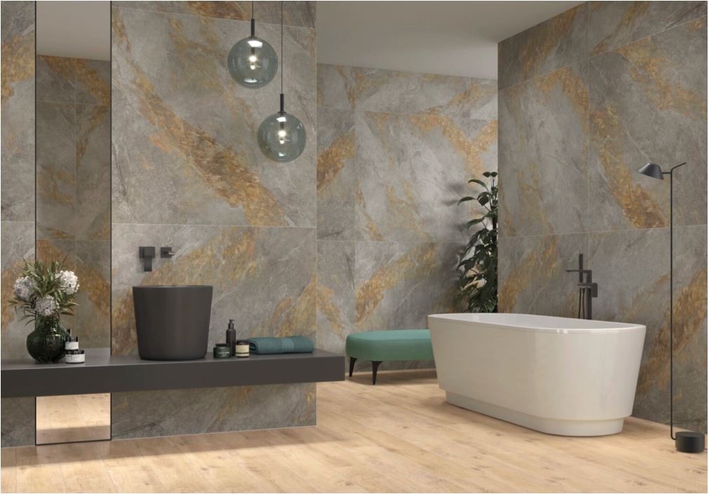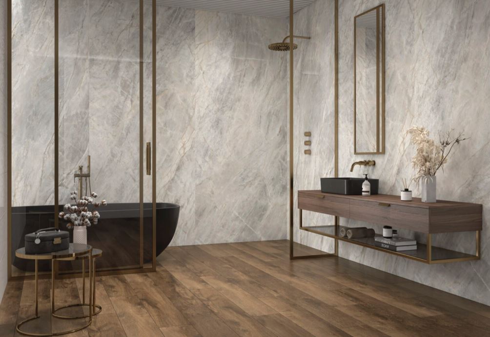 - Duże formaty (np. 120 × 240 cm) potęgują efekt przestrzeni i nowoczesnego minimalizmu, a płytki w klasycznym rozmiarze 60 × 60 cm sprawdzają się w każdej łazience.