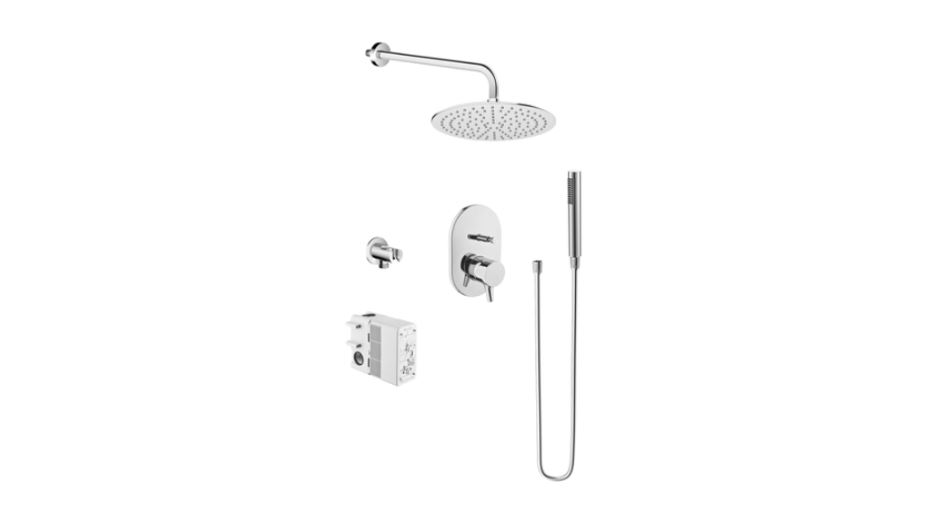 W zestawie znajdziesz deszczownicę o średnicy 23 cm z regulacją kąta nachylenia, 3-funkcyjną słuchawkę prysznicową z wężem o długości 160 cm oraz natynkowy termostat z blokadą bezpieczeństwa przy 38°C. System umożliwia łatwe przełączanie między deszczownicą a słuchawką, a silikonowe dysze ułatwiają usuwanie osadów kamienia. Dzięki temu rozwiązaniu zyskujesz pełen komfort – od delikatnego deszczu po mocniejszy strumień wody dopasowany do Twoich potrzeb.