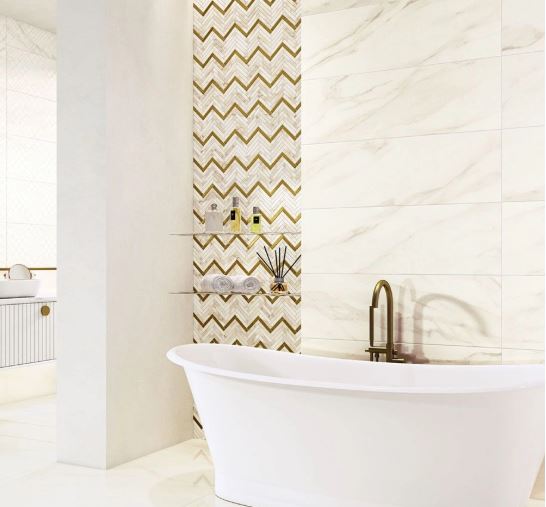 Płytki calacatta + płytki patchwork lub mozaika chevron – luksus marmuru przełamany artystycznym akcentem