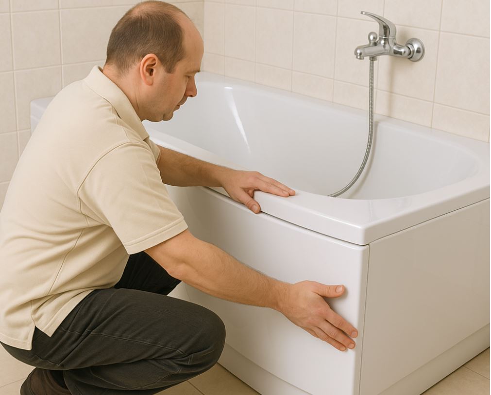 - Zamocuj obudowę – panel dopasuj do krawędzi wanny i osadź w systemie mocowania (najczęściej zatrzaski lub prowadnice).